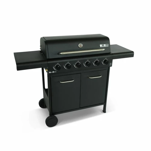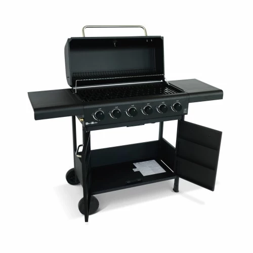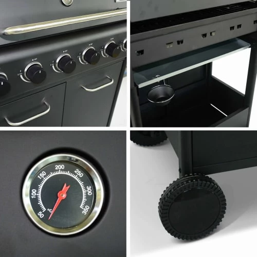 Ce barbecue noir en inox au design linéaire est équipé de 6 feux puissants, de deux grilles de cuisson en acier ainsi que d’une grille pour garder au chaud vos aliments. Un thermomètre est présent pour vous permettre de surveiller la température lors de la cuisson. Sa structure en acier est recouverte de peinture époxy, très durable et résistante. Ses poignées et et brûleurs sont en acier inoxydable et donc résistants à la corrosion.