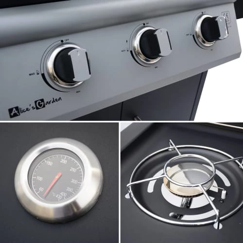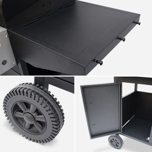 Les deux tablettes latérales du barbecue vous permettent de poser vos plats et aliments. Elles sont, en plus, dotées de crochets pour y suspendre torchons ou ustensiles (les accessoires ne sont pas inclus. Ils peuvent être achetés séparément). Par ailleurs, l’une des tablettes peut faire office de réchauffe plats car elle est dotée d’un brûleur. Le barbecue est livré avec 2 grilles de cuisson en fonte émaillée et amovibles, ainsi qu’avec une grille émaillée superposée qui garde au chaud les aliments déjà cuits.