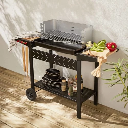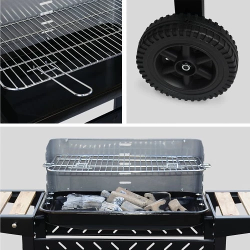 Structure tubulaire en acier peintCuve à charbon émailléePoignées de grille : 2, amoviblesGrille de cuisson chroméeHauteur de cuisson réglable sur 5 niveauxTablettes en bois : 2Roues : 2Crochets : 3