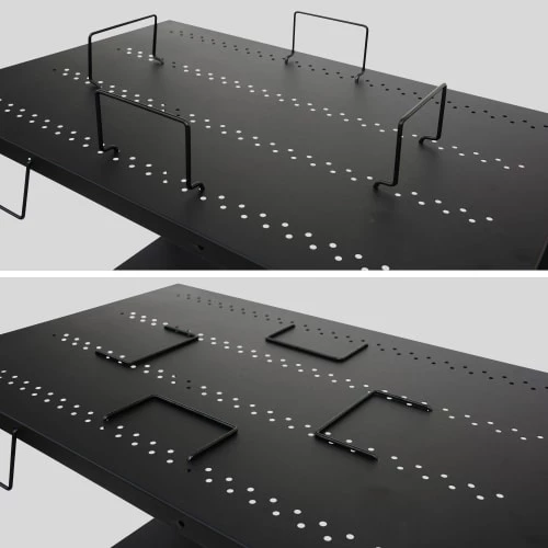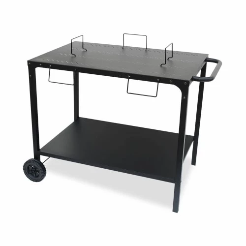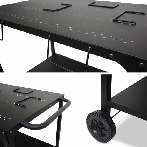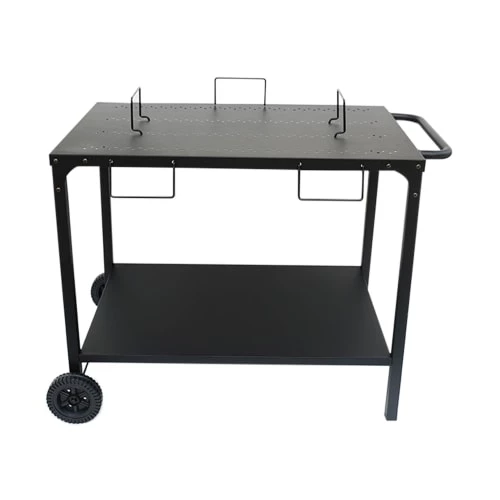 Cette desserte noir en acier est idéale pour utiliser votre plancha, mais pas que ! 5 crochets métalliques sont fournis et peuvent être placés où vous le souhaitez : sur le plateau supérieur perforé pour caler une plancha ou tout autre accessoire de cuisson, et sur le côté pour y accrocher des torchons et ustensiles. Cette desserte s’adapte à vos envies et besoins. Vous pouvez d’ailleurs tout autant l’utiliser à l’intérieur qu’à l’extérieur. Grâce à sa poignée et à ses deux roues, elle se déplace très facilement pour aller sur votre terrasse ou votre balcon pour vos repas conviviaux ! Sur le plateau inférieur, vous pouvez ranger vos plats ou la bonbonne de gaz de votre plancha.