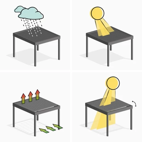 La pergola bioclimatique Triomphe vous permet de passer des moments agréables et conviviaux dans votre jardin sans vous soucier du temps qu’il fait. Contrairement aux autres pergolas, elle a la particularité de s’adapter aux différentes conditions météorologiques. En hiver, elle vous permet d’être protégé de la pluie ou de profiter du soleil et en été, d’apprécier son ombre et sa fraicheur. La pergola se fixe dans le sol, ce système est donc permanent. Plus besoin de ranger sa pergola à chaque automne, vous en profiterez toute l’année.