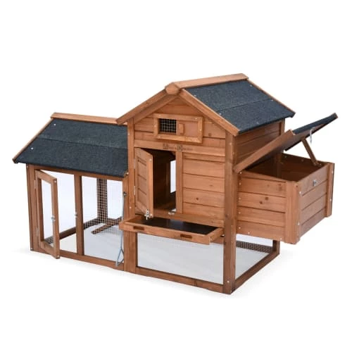 Adapté à 3 poulesMatière : SapinMatière du toit : feutre bitumé, protège de la pluie et de l’humiditéMatière grillage : acier galvaniséMatière tiroir à déjection : acier galvanisé Epaisseur des panneaux : 8mm1 perchoir intérieur1 trappe de ventilation coulissanteNombreux accès :-Porte d’entrée pour l’enclos avec loquet-Trappe coulissante pour l’accès au dortoir des poules, ouverture et fermeture grâce à la poignée extérieure.-Une ouverture avec loquet pour vous faciliter l’accès à l’abri surélevé