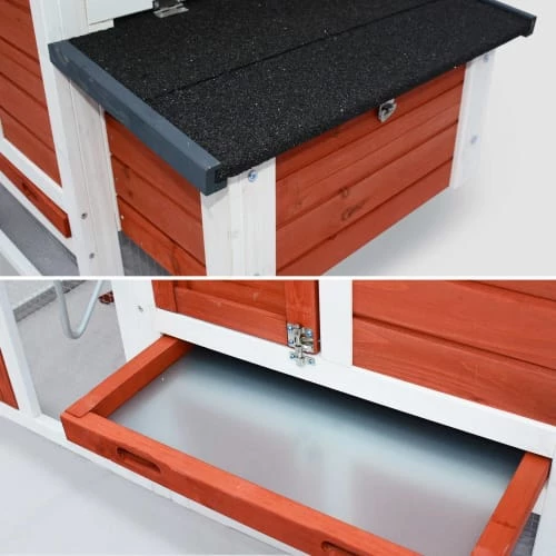 Envie d’élever des poules et d’avoir des œufs frais? Le poulailler Galinette est ce qu’il vous faut. Ce poulailler en bois de sapin accueille 3 poules. Pour leur confort, il possède un étage à l’abri qui les protège des intempéries, des prédateurs et favorise leur repos. Elles y montent grâce à une rampe d’accès. Cette maison pour poules est également équipée d’un perchoir et d’un pondoir à deux compartiments. Le toit est ouvrable pour pouvoir ramasser les œufs facilement.Par ailleurs, la cage à poules est dotée de nombreux accès et d’une trappe de ventilation coulissante.Pratique, le tiroir de déjection est amovible pour vous simplifier le nettoyage.Le poulailler Galinette est constitué de panneaux épais de 8mm qui garantissent solidité et isolation. Le feutre bitumé sur le toit renforce l’isolation et protège de la pluie et de l’humidité.