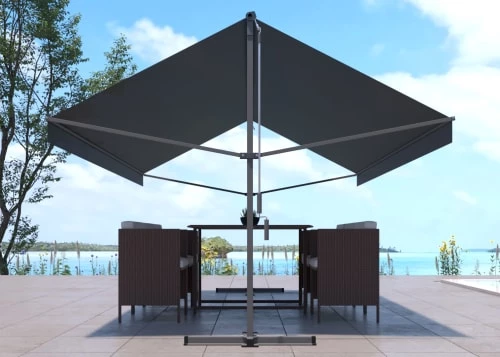 Déjeunez dans votre jardin à l’abris du soleil grâce à ce store banne double pente gris. Sa toile waterproof peut aussi vous abriter de faibles pluies pour que vous profitiez davantage de votre extérieur !