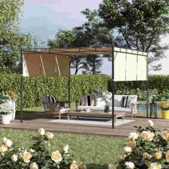 Outsunny Pergolas Et Tonnelles Pergola Rétractable Métal Noir Double Toile Polyester Beige